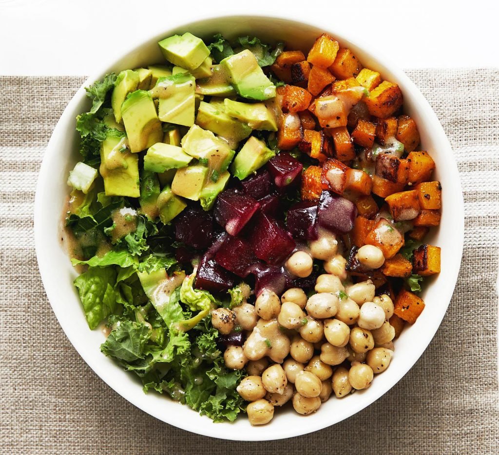 2. Place romaine and kale on the bottom of a platter, top with squash, beets, garbanzo beans, and avocado.