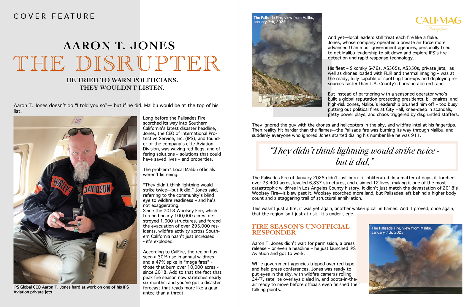 Long before the Palisades Fire scorched its way into Southern California’s latest disaster headline, Jones, the CEO of International Protective Service, Inc. (IPS), and founder of the company’s elite Aviation Division, was waving red flags, and offering solutions – solutions that could have saved lives – and properties.